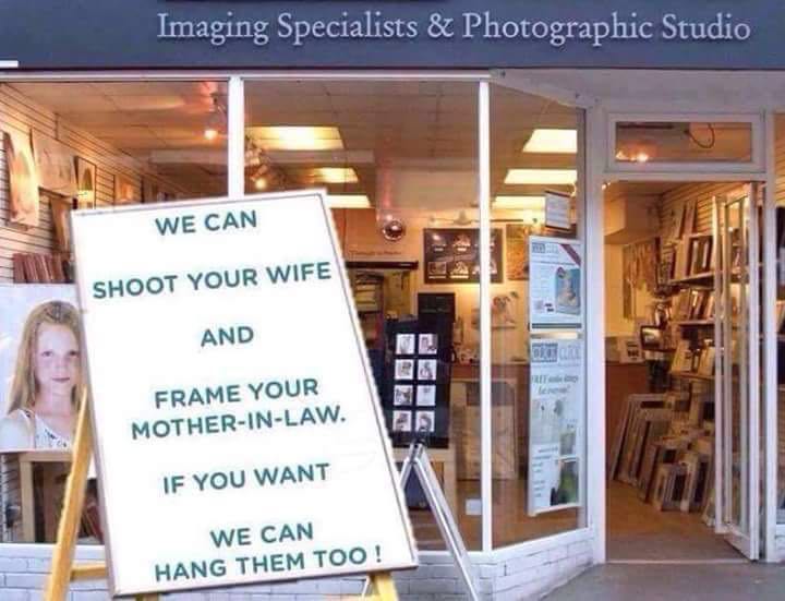 ENTERTAIN - It says Imaging Specialist and Photographic Studio... And this is how they advertise and i think this is funny and push '' We can shoot your wife and frame your mother - in - law, if you want we can hang them too lolololo i can't stop laughing what a funny advertisement. Continue to see more funny videos, click on the link below...